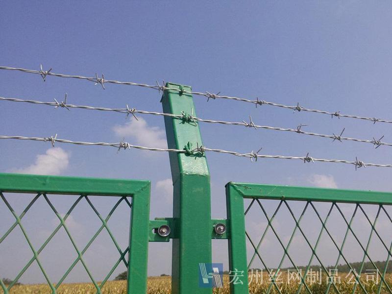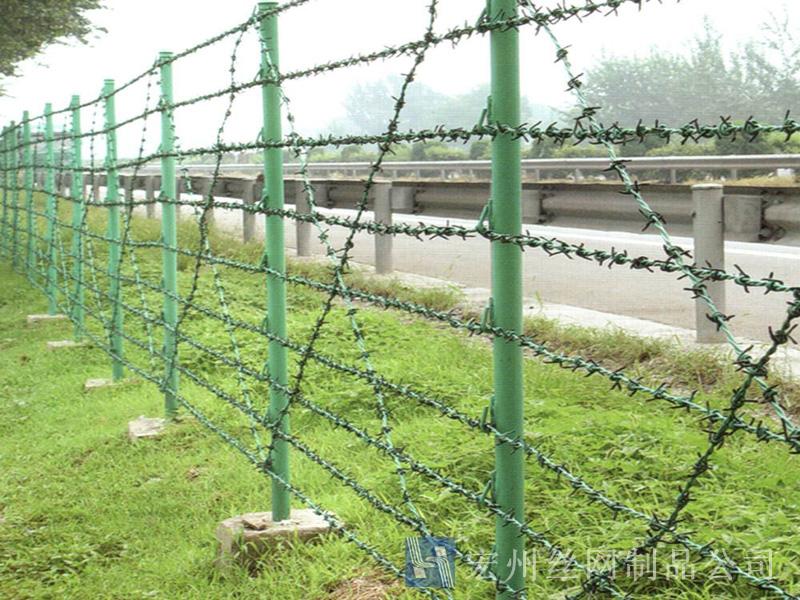 刺繩隔離網(wǎng),刺絲護欄網(wǎng),刺鐵絲隔離柵,刺繩護欄網(wǎng),鍍鋅刺網(wǎng)。宏州護欄網(wǎng)廠生產(chǎn)的產(chǎn)品主要分鍍鋅,浸塑兩種,是以立柱加刺繩制作而成, 刺繩刺鐵絲。
